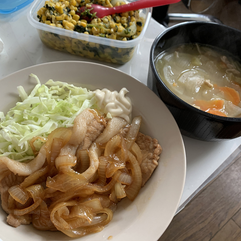 豚の生姜焼き+豚汁+コーンとほうれん草のバター炒め