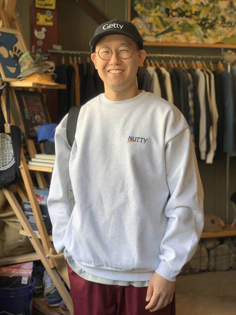 こういうカラーの強いのにはアッシュのクルーネックスウェットが合いますね。