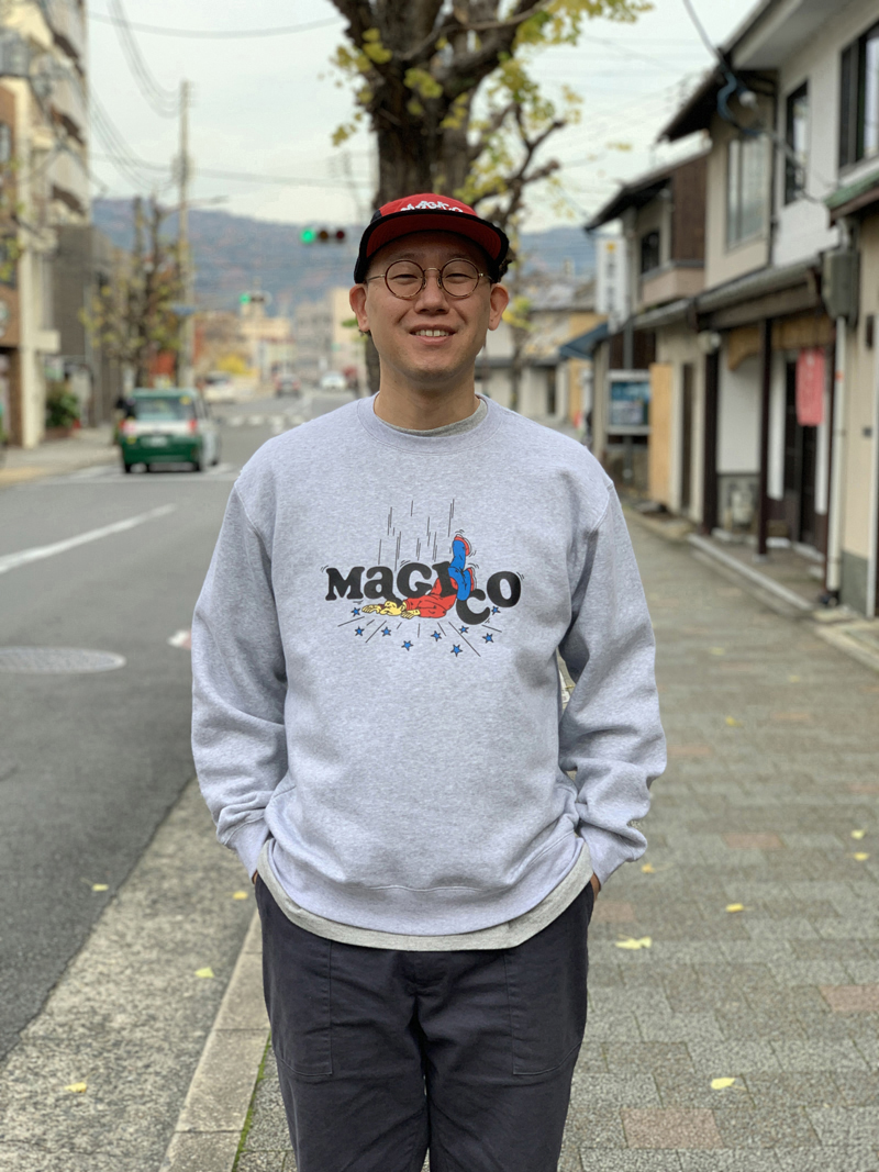 杢グレーにレトロでコミックの1コマの様なユルいグラフィックが魅力的なクルーネックスウェットで、スペインはバロセロナ発で女性アーティストの手掛けるブランドMAGICOのアイテムです。