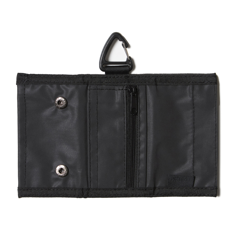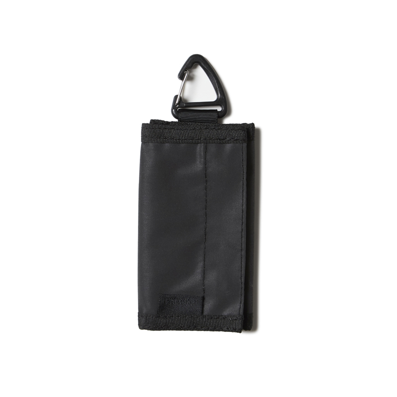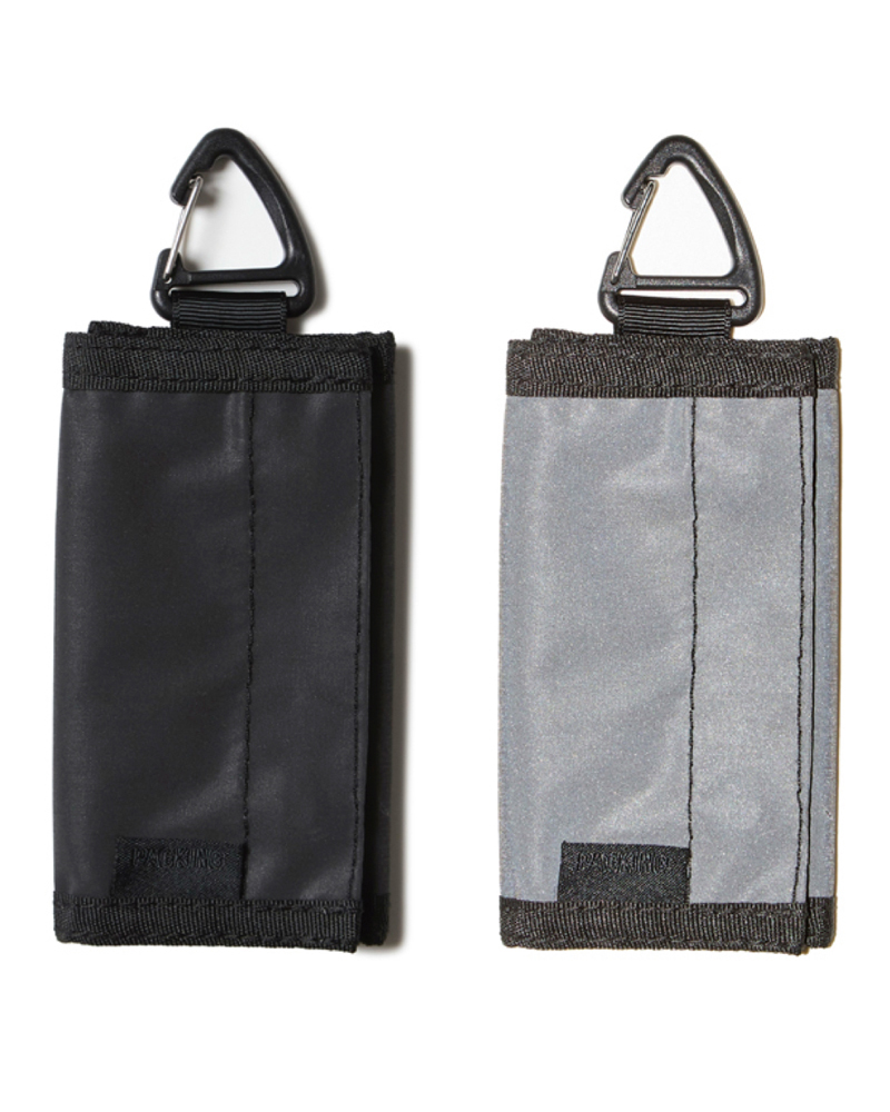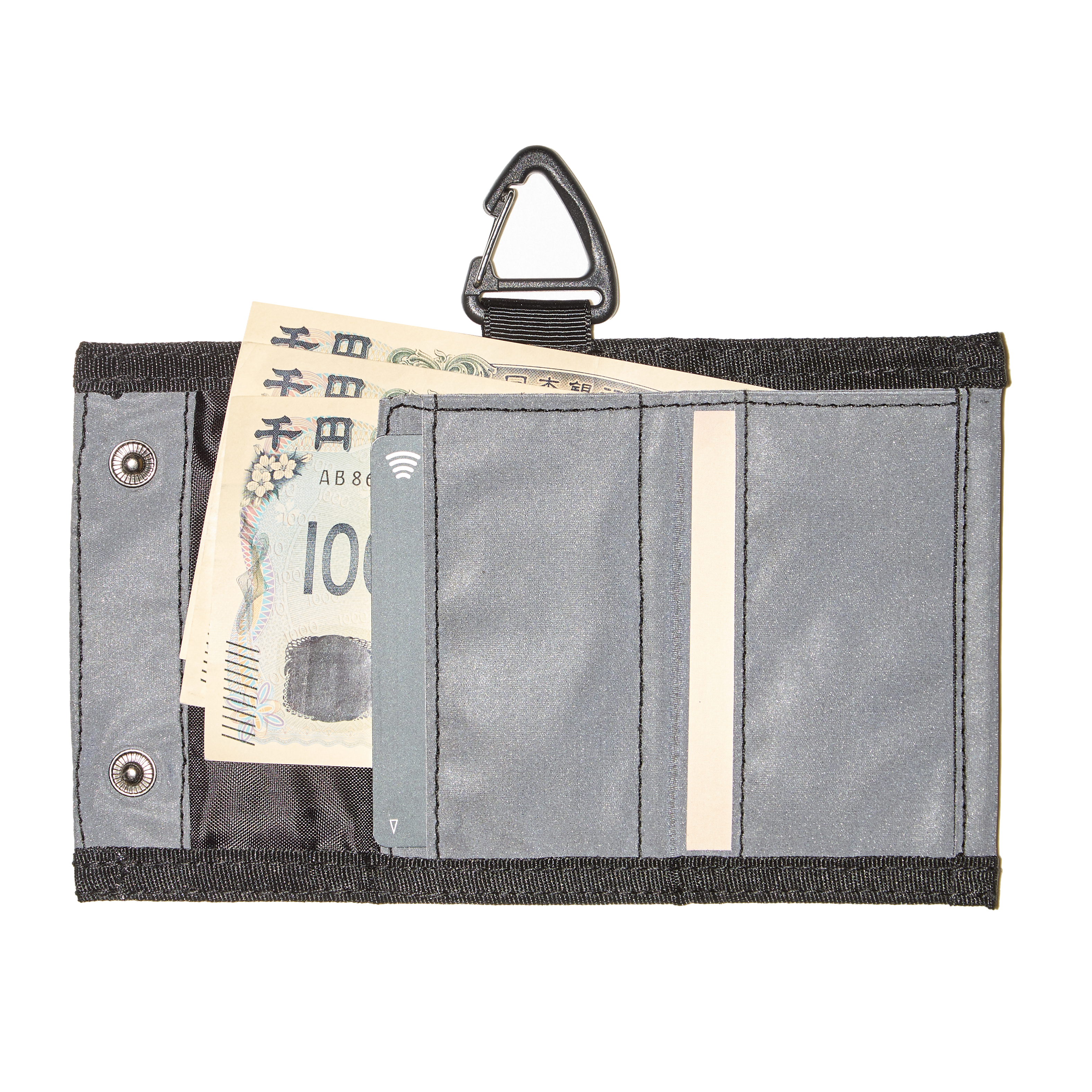 ユニークかつ機能的なブラックの反射素材を使用したコンパクトウォレットです。
