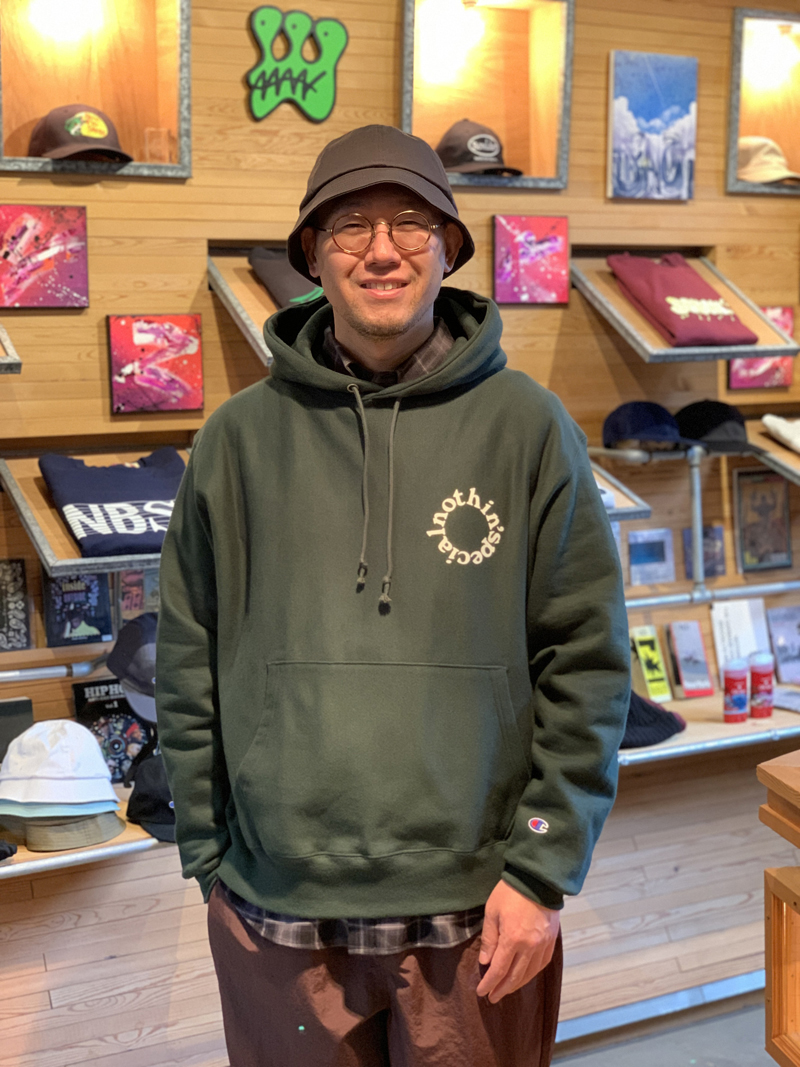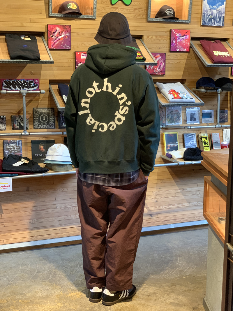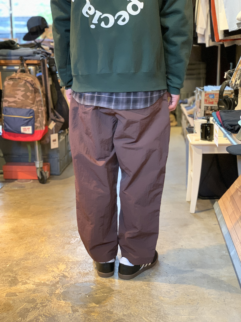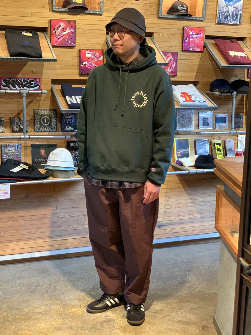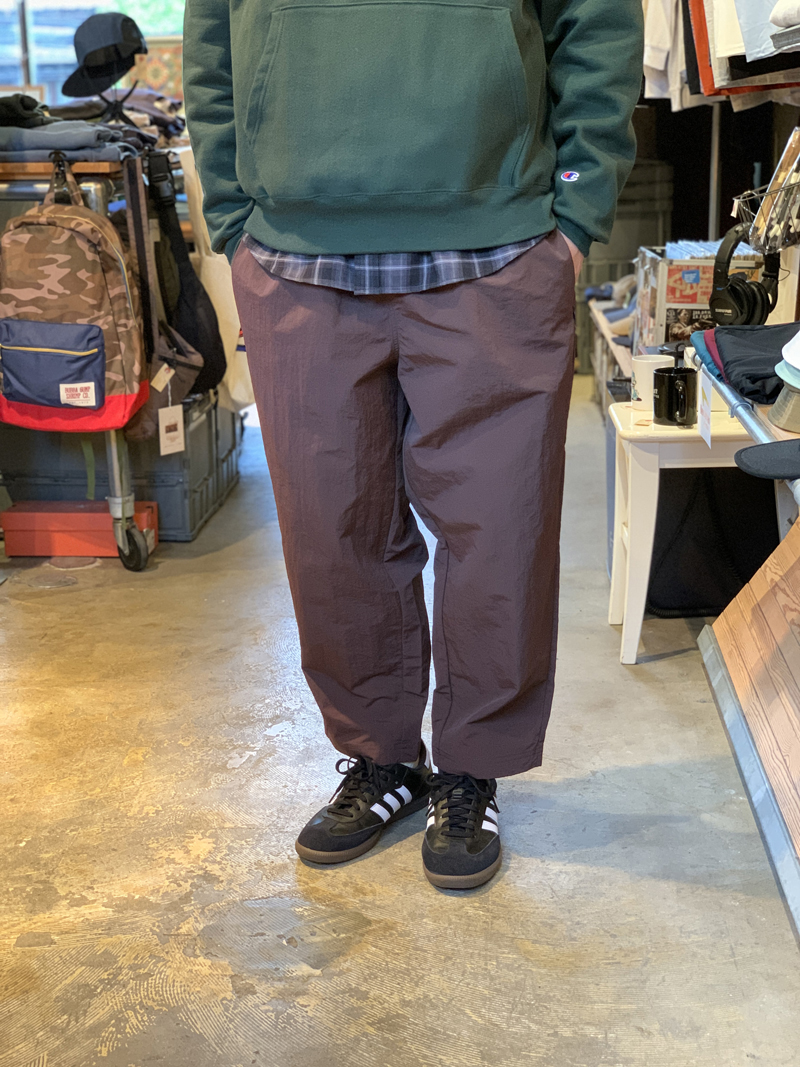 パーカーやボタンシャツが布っていう感じなので、ナイロンパンツを合わせて少し雰囲気を変えています。