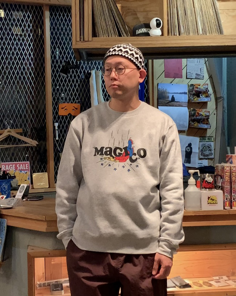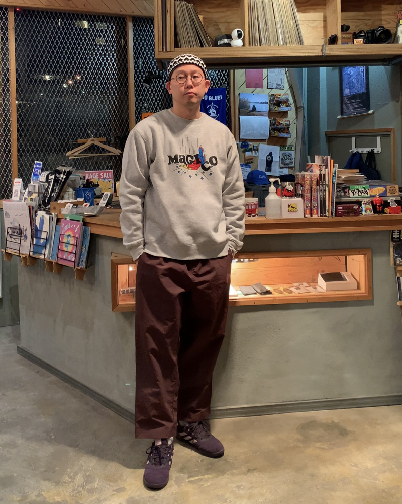 リラックスフィットなBAGGYSHORTSのナイロンパンツに、グラフィックが可愛らしいMAGICOのクルーネックスウェットです。