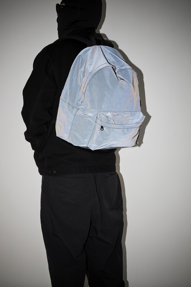 ユニークかつ機能的なブラックの反射素材を使用した大容量のバックパックです。