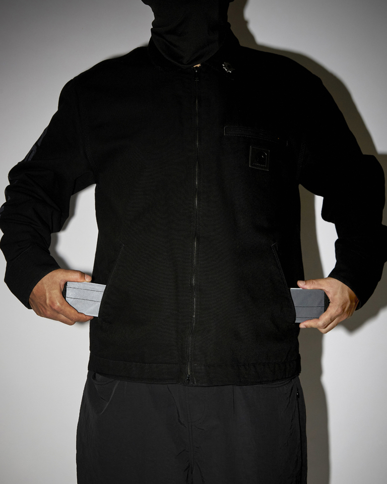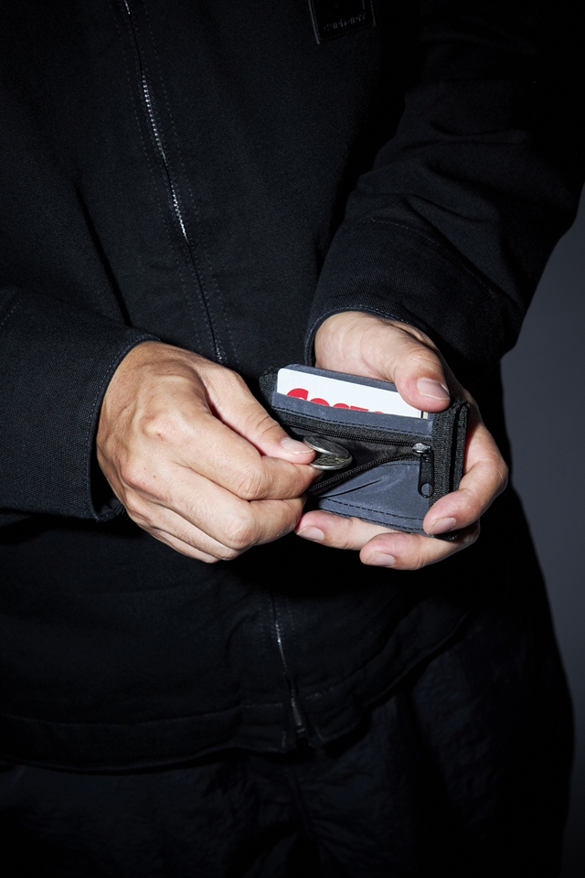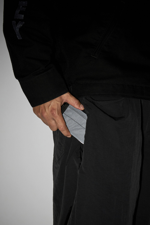 ユニークかつ機能的なブラックの反射素材を使用したコンパクトウォレットです。