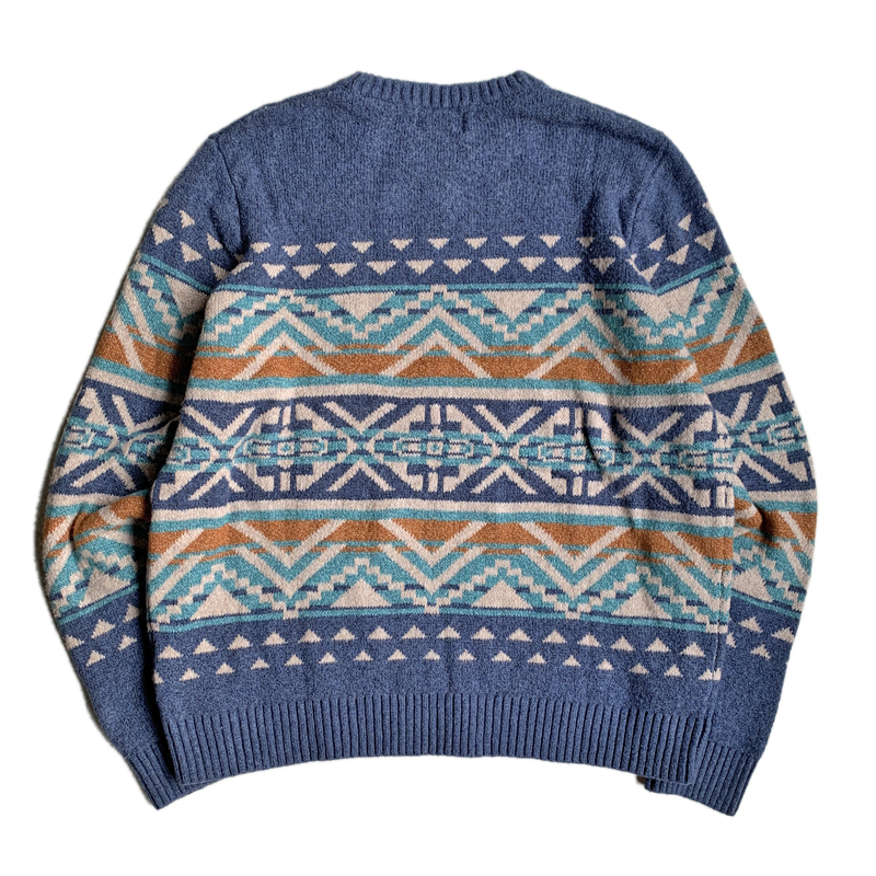 ネイティブ調のパターンながら主張しすぎず、シンプルなスタイリングにも自然に馴染む一枚です。