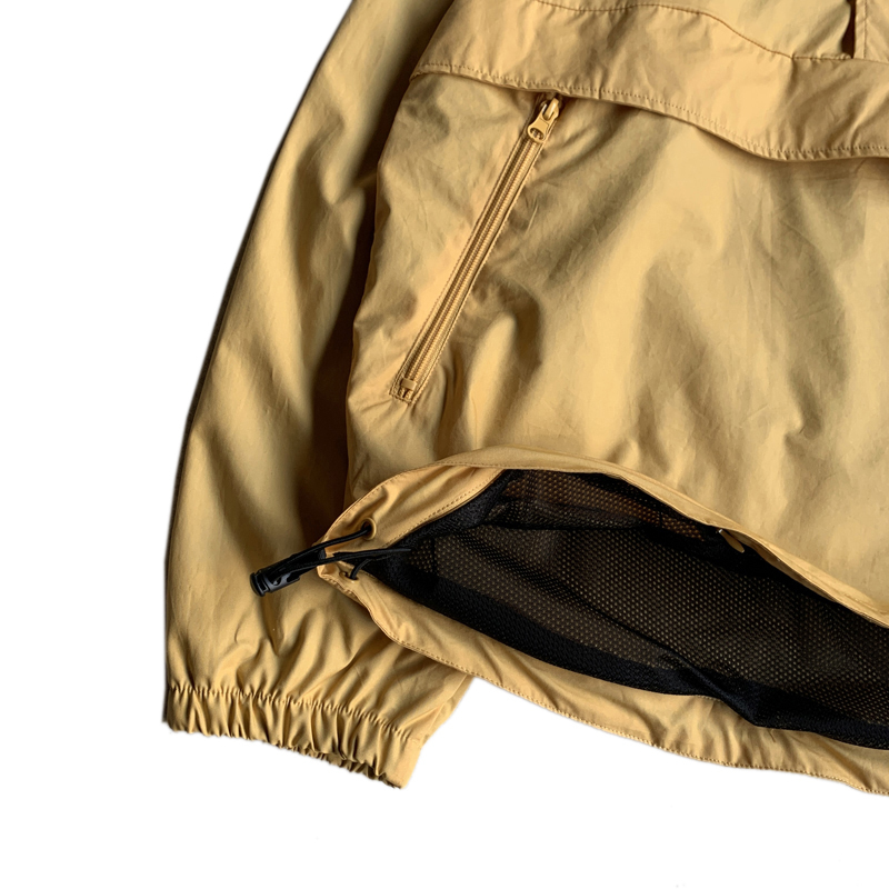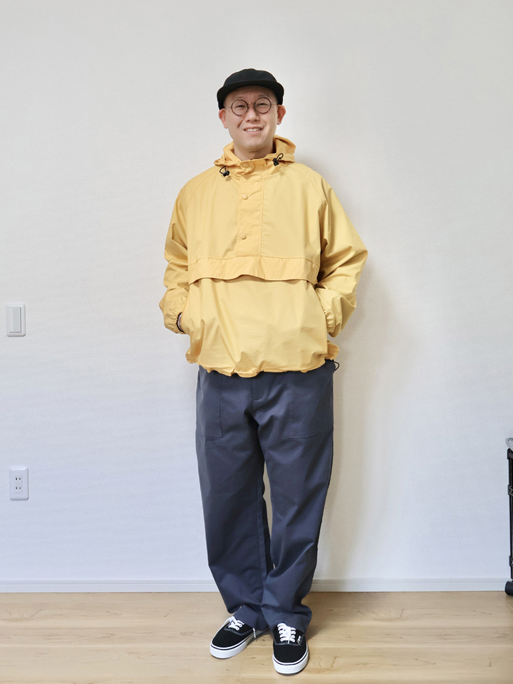 フロントのハーフジップも深めで身幅もゆったりなので、脱ぎ着のしやすいアノラックになっていてインナーには、ロンTにクルーネックスウェット、ネルシャツなんかも合わせれます。